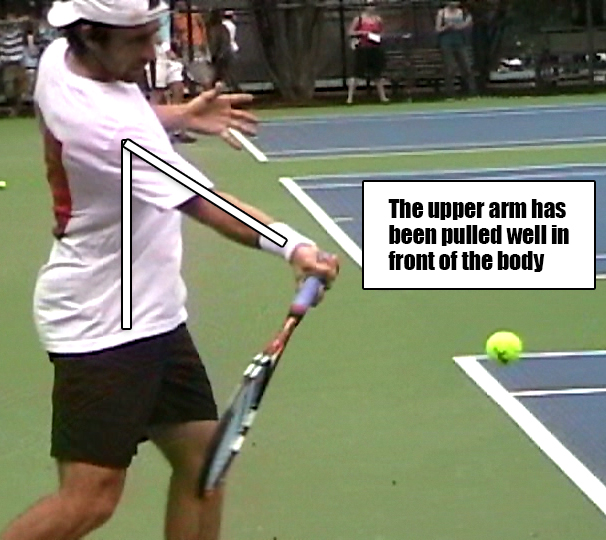 The still image on the right shows just how far the pulling action goes. The key indicator of a full pulling motion is that the elbow has been pulled in front of the body. And here we can see Becker's elbow is well in front of the his body. In fact his hand is about a foot in front of his body and is pretty close to the ball at this point, while the racket still lags behind his arm. One very effective "tip" is to imagine you are going to hit the ball with the butt cap of the racket. This will guarantee you have pulled your arm all the way through with the racket lagging behind.