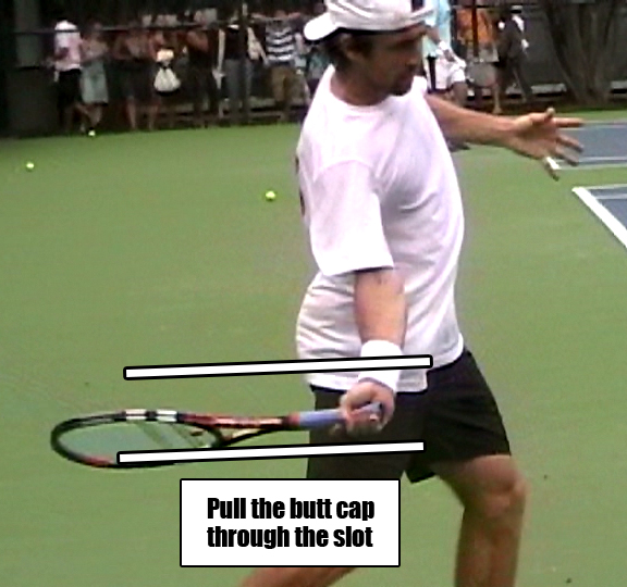 In the first half of the animation you can see how Becker is pulling the racket, butt cap first, through the slot. Tugging forward on the racket handle, with the butt cap pointing to the oncoming ball, accomplishes two things. First it gets the racket head to lag behind. Second, it gets the entire arm to pull forward.