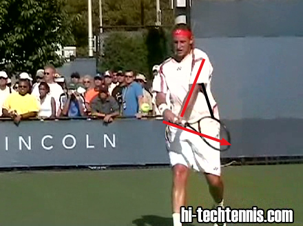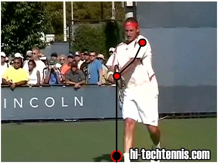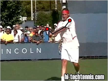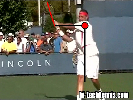 the hand and racket back while you lift your hitting arm and rotate into the ball. I drew a black line along Nalbandian's side so that you can see how his straight