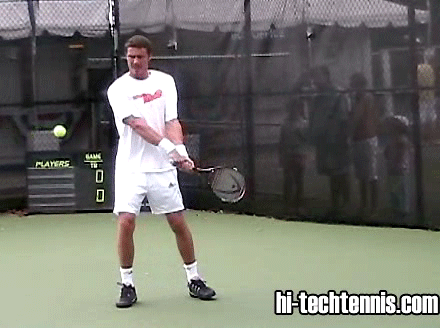 pointed at the net. As Safin turns and lifts into the ball, the racket